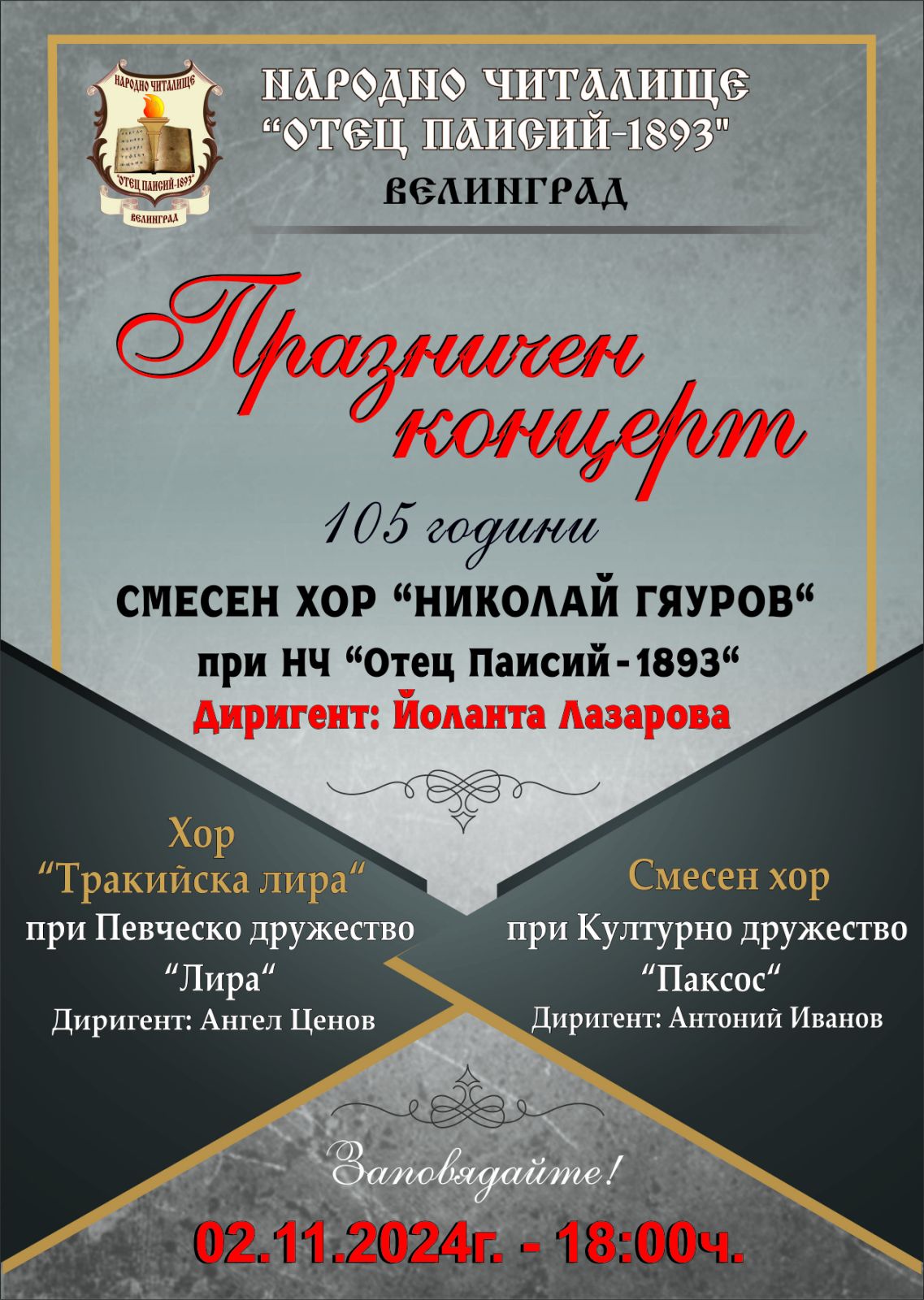 На 2 ноември Смесен Хор „Николай Гяуров“ към Народно читалище „Отец Паисий-1893“ ще чества 105 години от своето създаване. Хорът е създаден през 1919 година, като негов основател и първи диригент е уч...