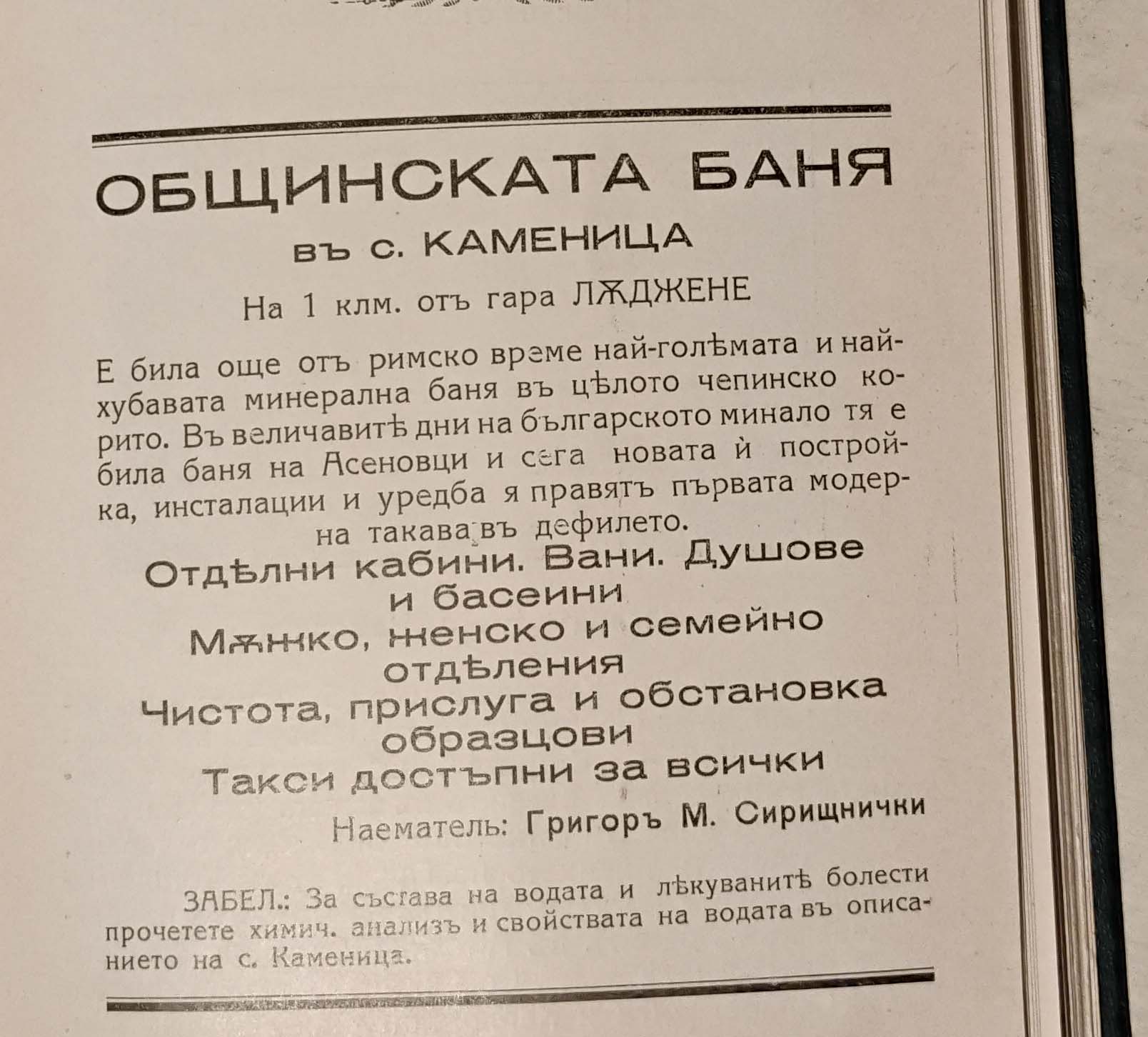 Поместена е рекламата на банята в Каменица с наемател Григор Сирищнички, в която четем: „Общинската баня в с. Каменица (на 1 км от гара Лъджене) е била още от римско време най-голямата и най-хубавата минерална баня в цялото Чепинско корито. Във величавите дни на българското минало тя е била баня на Асеновци и сега новата й постройка, инсталации и уредба я правят първата модерна такава в дефилето. Отделни кабини. Вани. Душове и басейни. Мъжко, женско и семейно отделение. Чистота, прислуга и обстановка образцови. Такси достъпни за всички“.