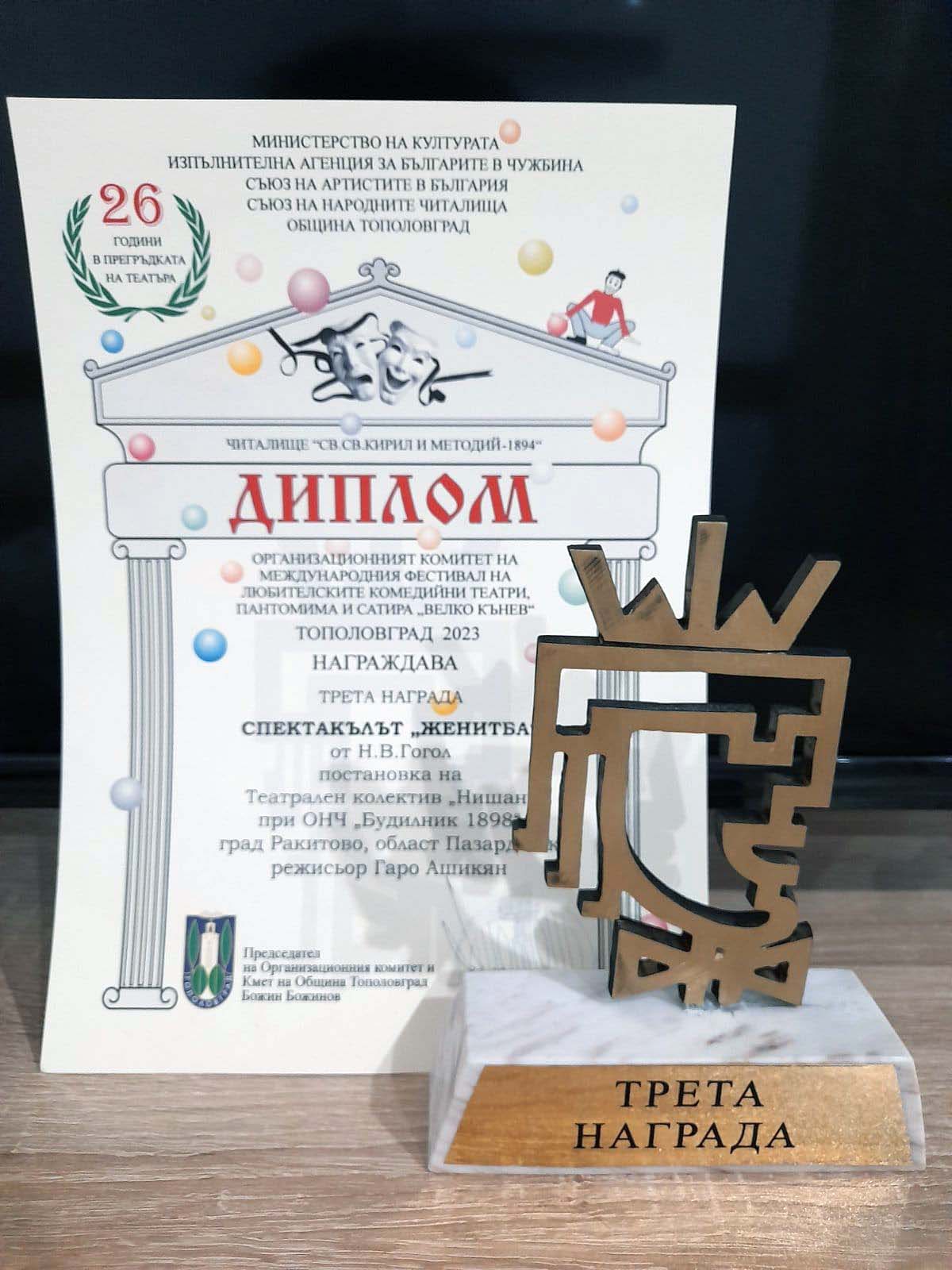 Театралният колектив „Нишан“ при ОНЧ „Будилник-1898“ в Ракитово се представи с постановката „Женитба“ на Н. В. Гогол с режисьор Гаро Ашикян. Талантливите самодейци Марияна Ишивова, Николина Левтерова, Мария Гергененова, Свилен Топчиев, Георги Балкански, Николай Минков, Димитър Ташев, Асен Кривонозов и Елена Димова на 19 септември спечелиха овациите на публиката и високата оценка на журито в състав: Калин Сърменов, Богдана Костуркова, Александра Сърчаджиева и Вълчо Янев и бяха отличени с Трета награда за спектакъл. Чаровната Марияна Ишовова грабна наградата за „Най-добра главна женска роля“ за ролята на Агафя Тихоновна. Димитър Ташев беше отличен за дебют за ролята на Анучкин.