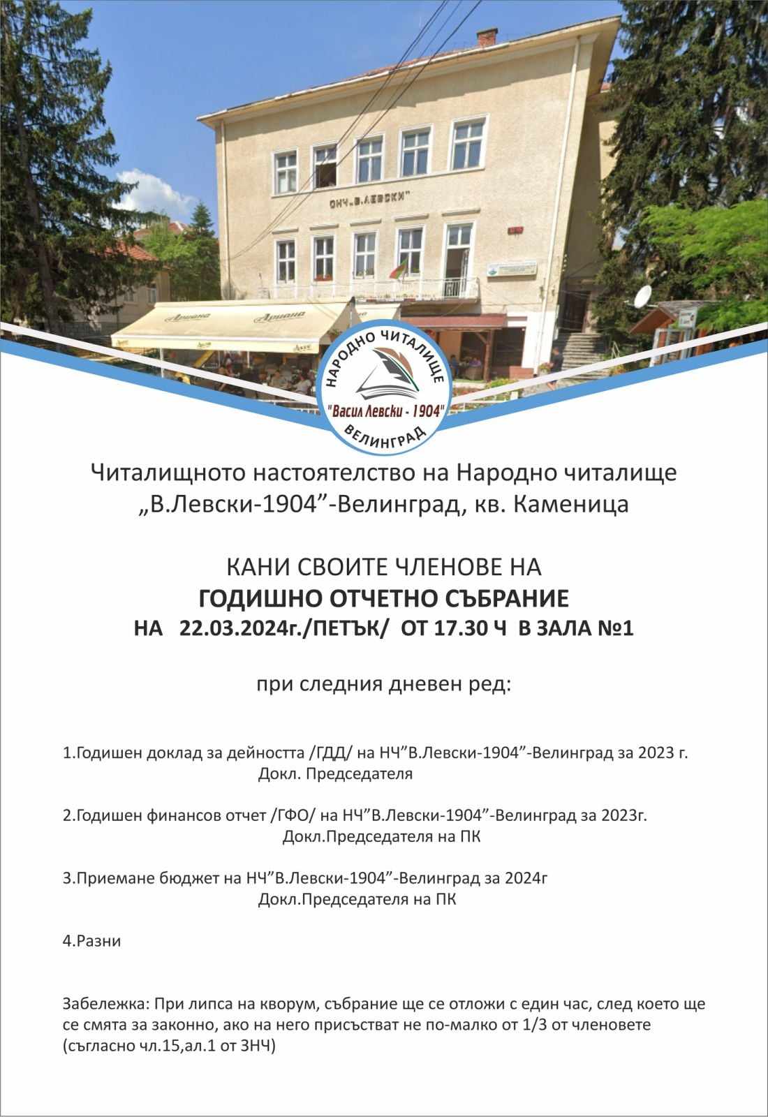 Обява за годишно отчетно събраниеДневен ред...